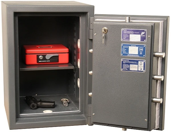 - Запирается сейф электронным немецким замком Wittkopp высокого уровня секретности. Замок активирует трёхстороннюю систему ригелей, снабжённую механизмом аварийной блокировки с применением калёного стекла, который жёстко фиксирует выдвинутые ригели при любой попытке силового вскрытия сейфа.
