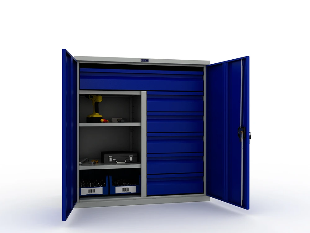 Предназначен для хранения различных инструментов и приспособлений, а так-же запасных частей и расходных материалов в мастерских, цехах и производственных помещениях.Шкафы для инструментов TC-1095 можно индивидуально скомпоновать под свои нужды выбрав необходимые вам комплектующие: перегородки, ящики (до 6 больших выдвижных ящиков TCF 87x45 или до 12 малых выдвижных ящиков TCF 42x45) так-же можно выбрать различные полки или перфорированный экран.