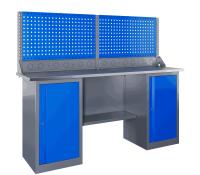 - Элегантное сочетание пыльно-серого и небесно-синего цветов придаёт верстаку привлекательный вид – это весьма существенно при установке в домашней мастерской или учебном заведении.
